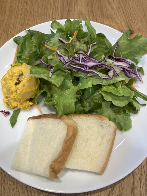 前菜は、さっぱりとしたグリーンサラダとかぼちゃと豆のサラダ、それとパンが二切れ。