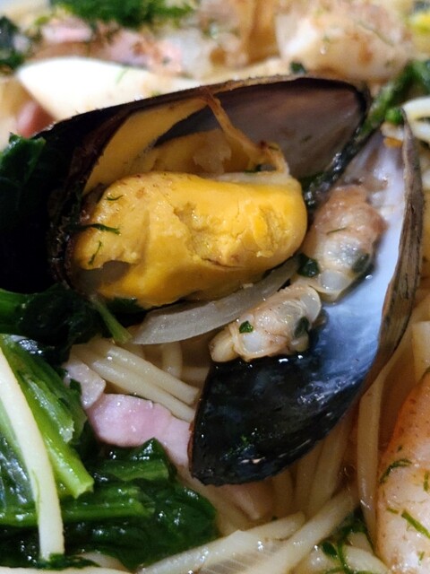 海老やムール貝にアサリ、更にはベーコンやウインナーも入ってて、パスタの量も乾麺状態で150~200g位あるんちゃう(;・∀・)?