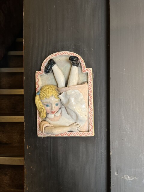 けれどもその前に、柱に掛けられた“穴を落ちるアリス”が目に留まります。そして階段の壁には淡い色彩の、現実と幻想が入り混じる壁画。あたかも不思議の国へいざなうかのようです。