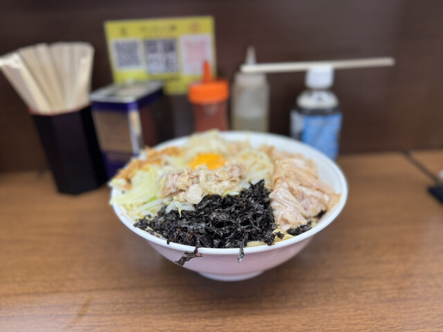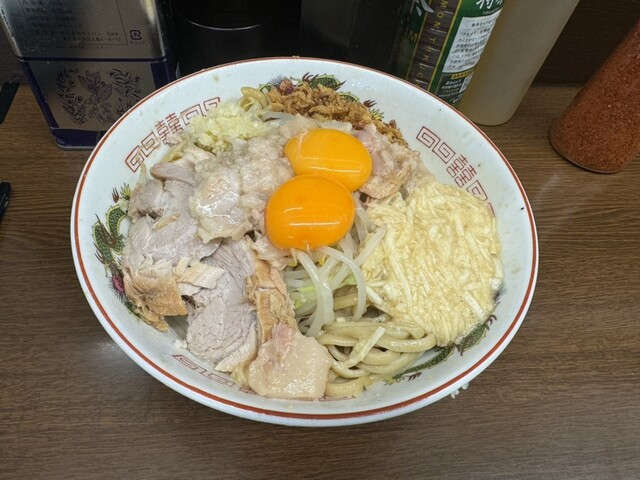 小汁なし・ニンニク・アブラマシ!トッピングはトロロ・生たまごです。