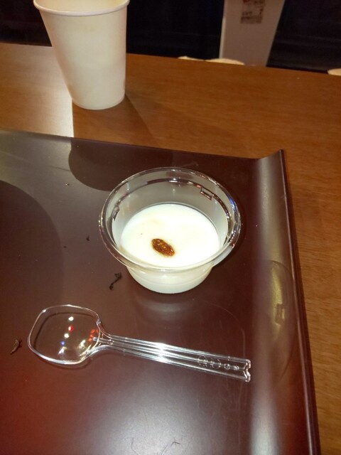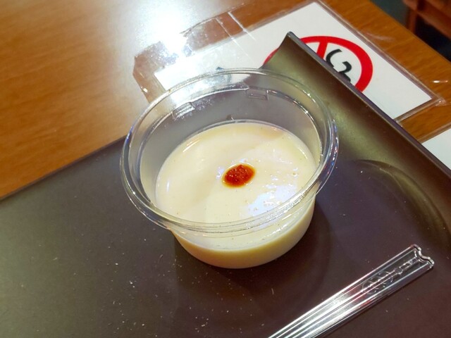 食後は通常の2.5倍盛りの杏仁豆腐を。7辛は結構辛かったし、花椒入れまくって舌が痺れているので杏仁豆腐は落ち着きますね。通常の2.5倍あるので、これだけでもまあまあ満足ですが、今回は折角なので「幻の10倍杏仁ドリンク」も。元々天秤の杏仁豆腐はしっかり杏仁の味がありながら飲める軟らかさなので、これを単純にタピオカミルクティーとか入っていそうなドリンク容器に入れただけのものです。タピオカ用の太いストローなのでそのまま飲めます。杏仁豆腐好きとしては夢のようですね。