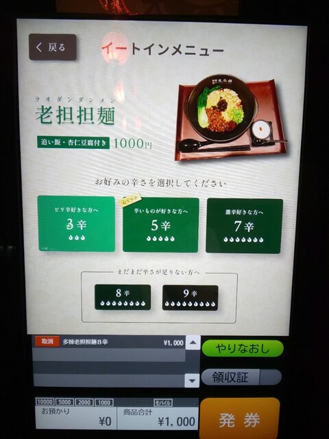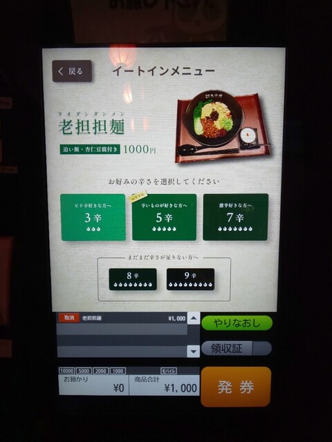 老担担麺は5辛が標準で、その下に3辛、その上に7辛があります。7辛よりも更に上もあって、8辛、9辛まであります。