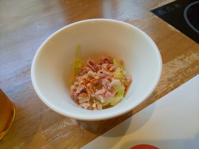 今月の前菜は、新キャベツと燻製鴨、アーモンドの和え物です。