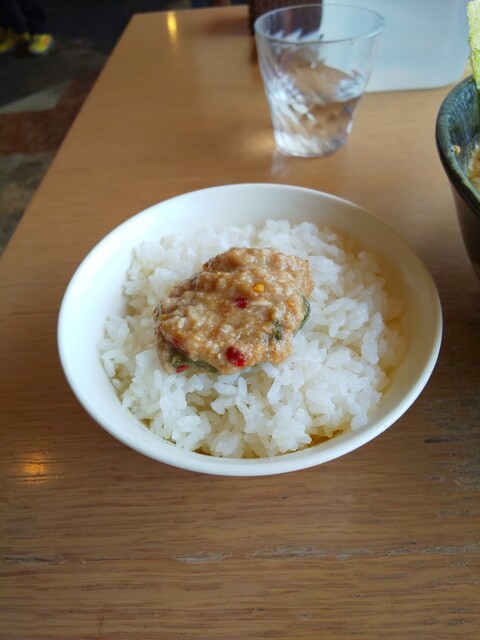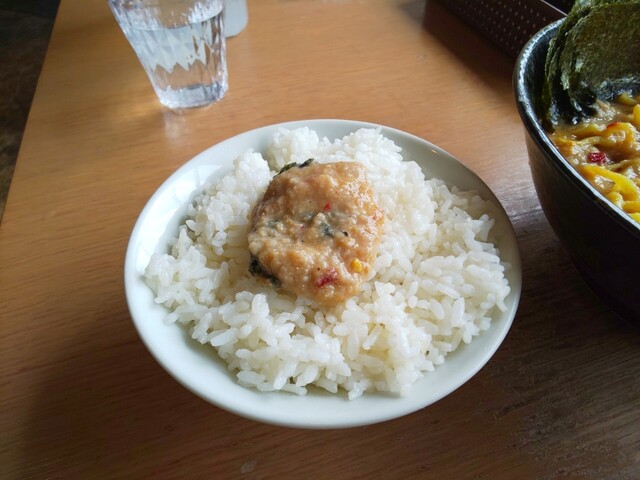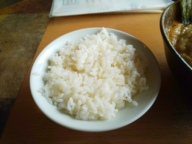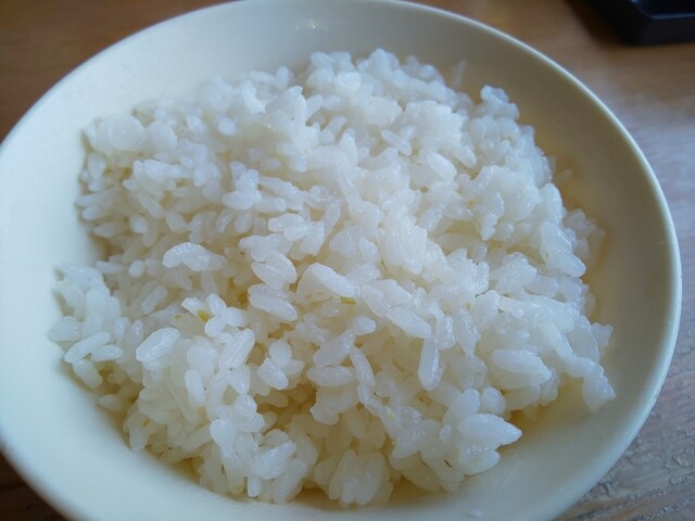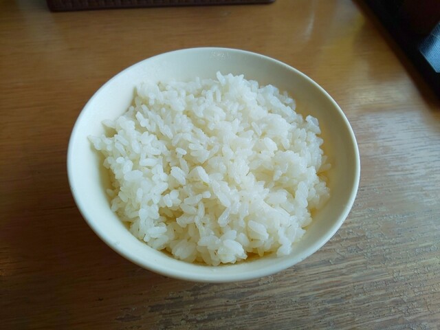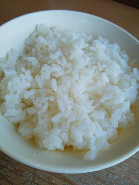 前の人にラーメンが出される進捗を見て、セルフサービスのご飯を取りに行きます。タイミングを見計らって行ったつもりでしたが、結構待ち時間が生じてしまったので、普段はしませんが、ご飯をじっくり観察して味わってみたいと思います。水分多すぎの時もありますが、今日は水分少なめ、硬めの仕上がりです。米粒のサイズは小さいと言うが、結構砕けている感じです。味はかなりあっさりですが、旨味も甘味も感じなくて不味い…というほどではありません。まあ、あの特鳥スープをかけて食べる前提なら、硬めであっさりなのは正解でしょう。ちなみに、昼オープン直後ですが炊きたてではありません。
