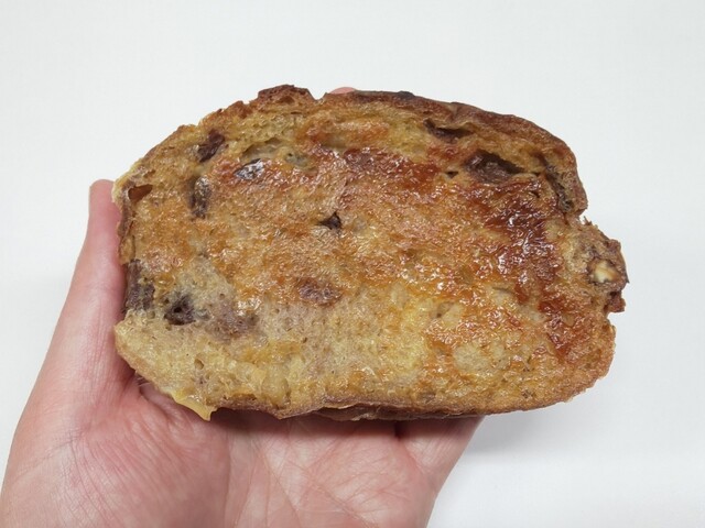 「ダーシェンカのフレンチトースト」の「ダーシェンカ」とはお店の名前ではなく、看板メニューのレーズンとクルミの入ったパンのことで、おそらくこれの大きいサイズの方をスライスして、フレンチトーストに仕上げたものです。卵でフレンチトーストっぽい部分もありつつ、ベースが普通の食パンではなくレーズンの入った「ダーシェンカ」なので、普通のフレンチトーストとは全く異なる面白い味わいです。何かに似ているような…そうだ、カヌレっぽいですね。