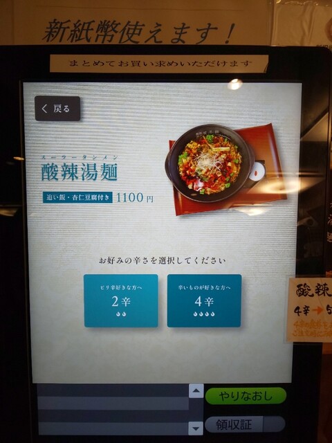 券売機❨新札対応❩で「酸辣湯麺4辛」を購入し、5辛に変更します。