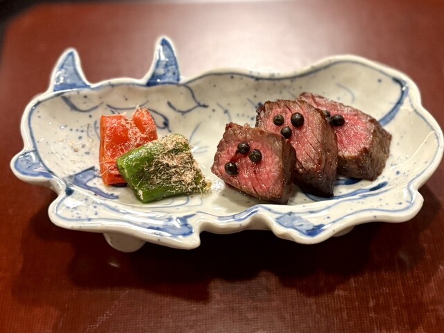 赤身肉ですが、綺麗な断面が生の野生味を感じつつ生の粒山椒が味を引き締めてくれます。