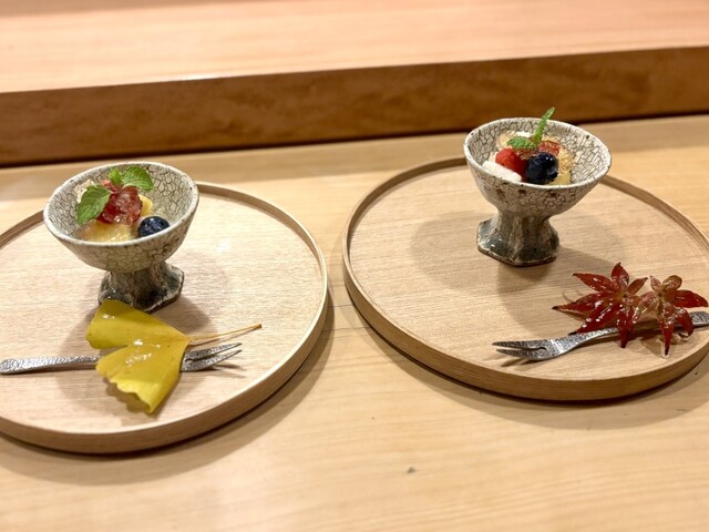 大変柿が瑞々しくて秋を食しているなと感じます。雲丹が滑らかな口当たりで、また、柚子が爽やかさを演出しています。