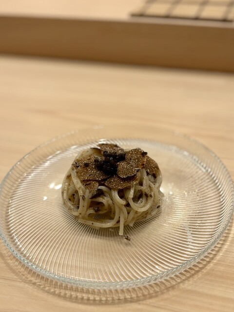 しかし、麺のツルツルした食感硬さは抜群で、トリュフオイルにバターとでかなり濃厚な味付けです。見た目も黒トリュフをふんだんに削って、そこにキャビアを添えていますので豪華な麺です。