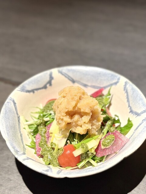 サラダは水菜、フルーツトマト、うるい、新じゃがで構成さられ、特にうるいですが、瑞々しくシャキシャキした食感が楽しかったです。