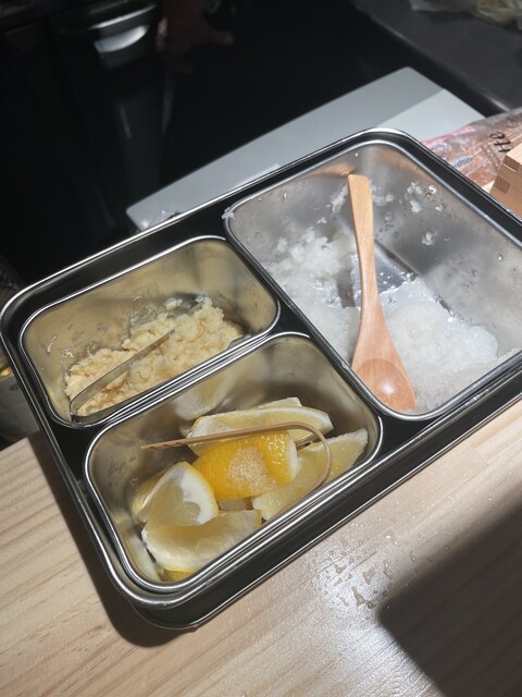 味付けは天つゆの他に、レモン、大根おろし、生姜があるよ!