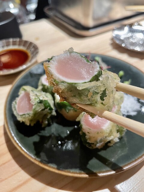 ささみを大葉で巻いた上に薄く衣でひと揚げ