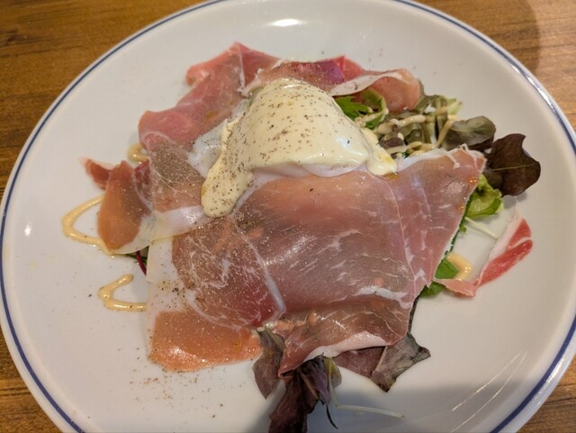 シンプルなグリーンサラダ ウッフマヨネーズと生ハム
