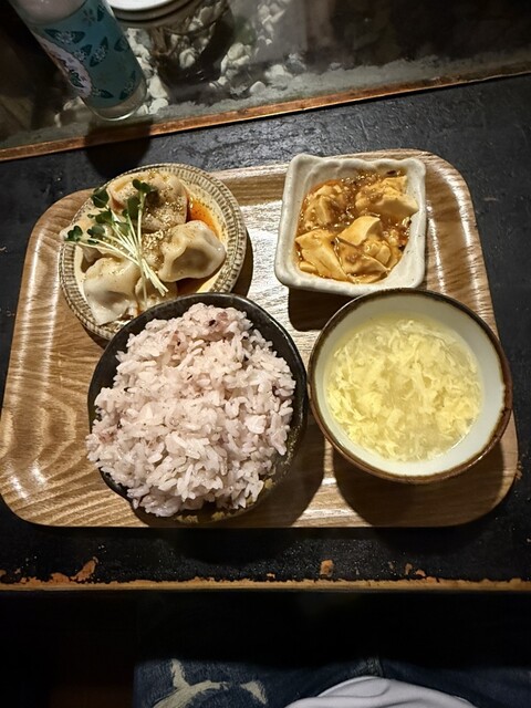 まずは2個を餃子をご飯にバウンドさせていただく。旨い。そんなに辛くはないです。もちもちした皮がちょうど良い感じで好みです。中華スープで口直し。付け合わせの麻婆豆腐をご飯にかけて、麻婆丼にしていただく。中華スープで口直し。残ったご飯と餃子2個をいただく。最後に残った中華スープで〆る。