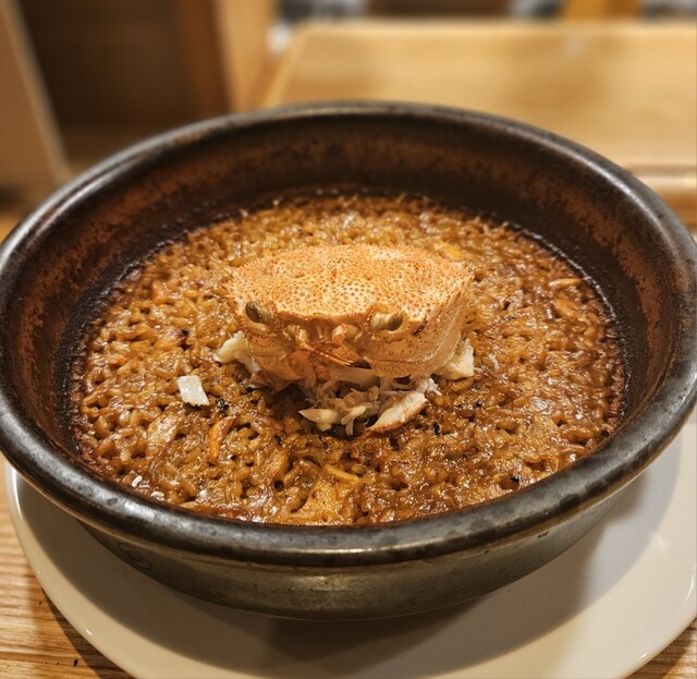 石巻産の毛蟹のアロス(パエリア)炊きたてホカホカと湯気が上がってますね。