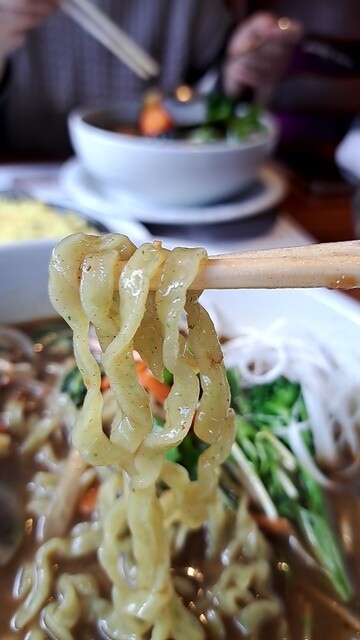 手打麺は、スープスパイスよりはあっさり目だけど、旨味があり、また、この平打ちの縮れ麺がいいのよ!