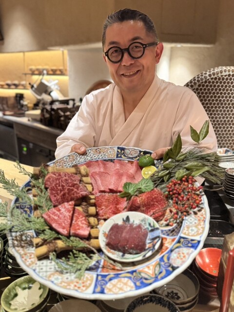 名古屋でも名物の大皿焼肉。古伊万里の金襴手の皿に盛り込むその日一番の特上肉は見た目も華やか!この日のお肉は黒毛和牛のタン・ヒレ・サガリ・ランプ・イチボ・レバーでどれも高品質!