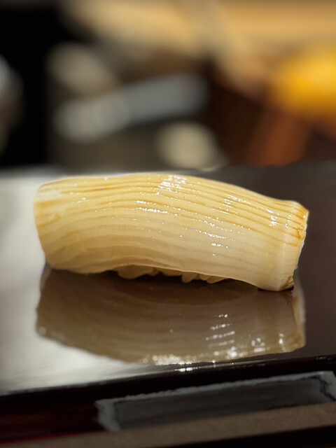 初手は名物となっている大間の本鮪大トロから。素晴らしい包丁の入れ方で口で溶けるとはこのこと!脂が甘くて絶対みんな笑顔になる!鯖の巻物も驚く程に脂が溶けて美味い。続いてアオリイカはねっとりとした口当たりで甘い!春子鯛はカットの仕方も美しくゴツゴツとしたフォルムとは裏腹に繊細な味わい。美味しいとろたく軍艦にはキャビアを添えて。甘さに程よい塩味が加わり本当に贅沢な旨味!コハダの締め具合も酸味が強くなく程よいしフォルムも美しい。そこからぼたん海老とバフン雲丹という高級食材が最後まで止まることなく続き、穴子で〆!雲丹も甘くて美味しかった!