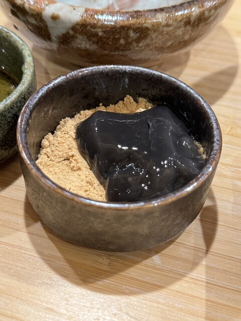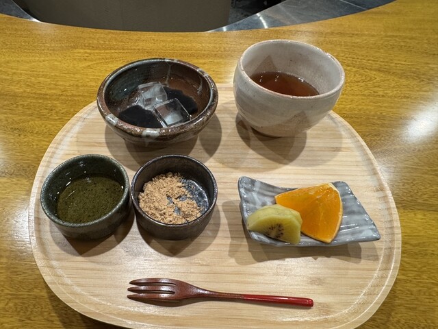 デザートまでしっかりしたプレートが登場!漆黒の艶やかな色味が特徴の貴重な蕨もちに京都の黒蜜ときな粉を合わせて食べるとめちゃくちゃ美味しい!果物も付いてるけど、このわらび餅は衝撃でした!