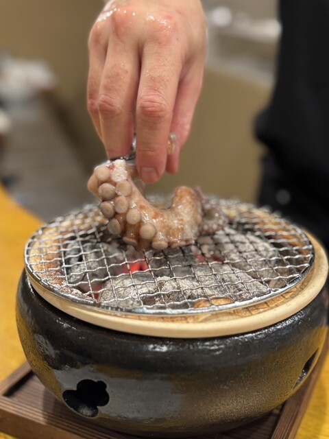 小さな七輪が一人ひとつ運ばれてきて、中には備長炭がぎっしり。ふぐは縁側と身皮と珍しい部位。柔らかく淡泊ながら甘みのある部位で箸が止まらない。そして今切ったばかりのタコの味が七輪に乗せられると、足が暴れる暴れる!笑
