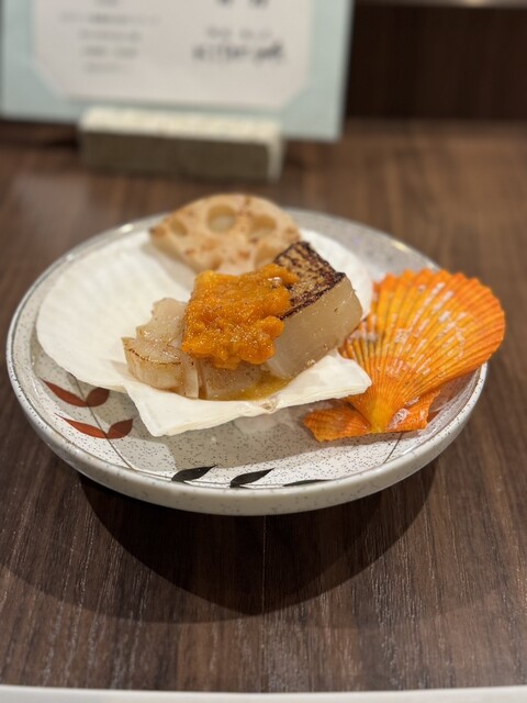 海鮮の目玉が大粒の帆立の上に雲丹を乗せた贅沢な一品。焼いた帆立と雲丹は香りが良く旨味がより一層強くなります!ビールが合う!