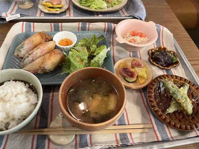 友人は鶏ハンバーグ、私は珍しい大根とエビの春巻!後、色んなおかずが可愛い器に入ってて、可愛いし、とても美味しかったです。