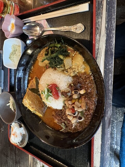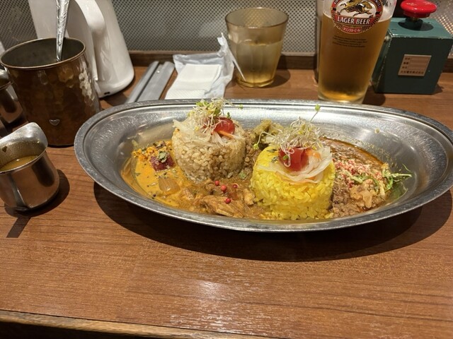 4つの種類のカレーから、2つか3つ選べます。ゴルゴンゾーラ、鯵の入ったカレー、牛豚のキーマの3種を...