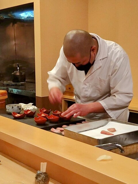 さて、近海を中心に独自で入手した旬の魚を丁寧な仕事と発想力で洗練した鮨へと昇華する大将の仕事は一口で人々を幸せにする。しかも、それは驚くべき価格で提供されるのだから、昨今の人気具合は必然か。加えて調理中に於ても客人方への気遣いと楽しい会話を絶やさない姿に、年齢を遥かに超えた余裕を感じるのは私だけか。