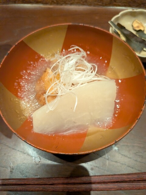聖護院大根をすりおろしたみぞれは、やさしく包み込み、口の中で雪解けのように旨味を広げます。