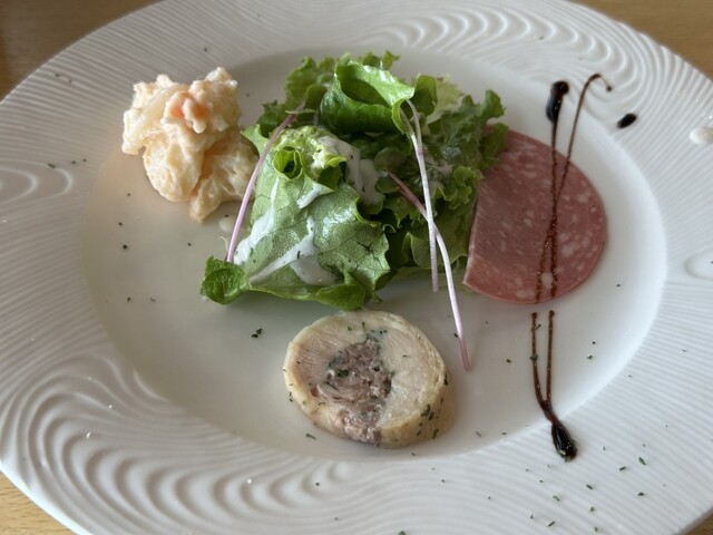 グリーンサラダ、ポテトサラダ、鶏肉巻き、鰹のたたきカルパッチョ風