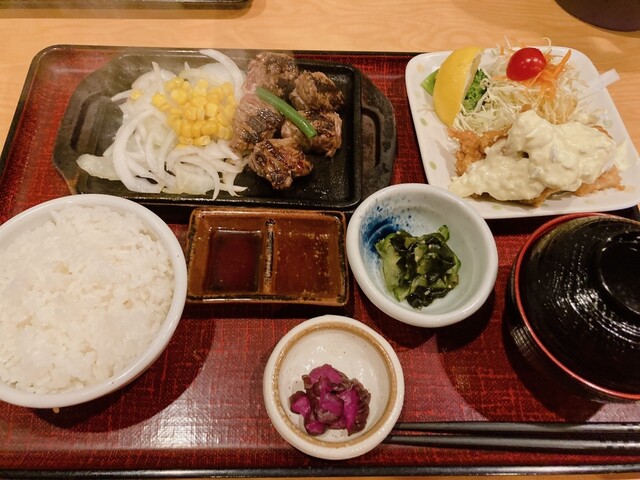 日替わりランチハーフとサイコロステーキ5個¥980-税込 安〜うサラリーマンの味方