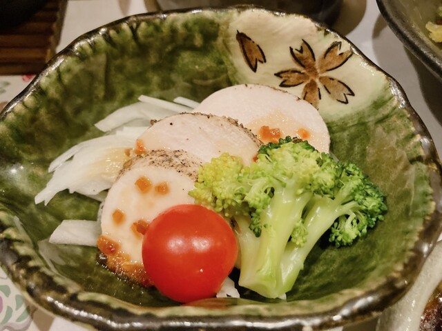 後から鶏のサラダ❓天ぷら、土鍋で鯛飯、シャーベットが出てきた。