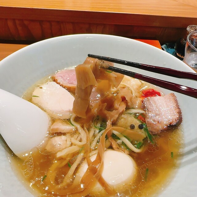 うぉぉ〜旨いっ!ミネラルたっぷり清湯スープ。なのだけど,乾物?魚介?ほのかに鴨の風味がする複雑旨旨和テイスト。麺はつるもちの中太手揉み麺チョイスでしたので,スープがよく絡まり国産小麦の甘味を感じます。
