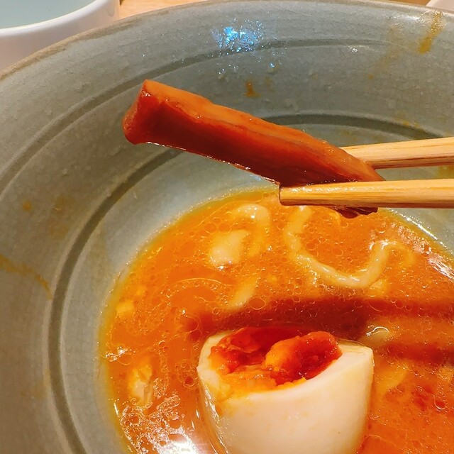風味満載のとても品のあるラーメン店とは思えない出汁!そして油そば,インパクト大の極太自家製麺を…おぉ〜これはこれは!加水率高めのモチモチ食感,まるですいとんのようで腹持ちの良さげな極旨麺!
