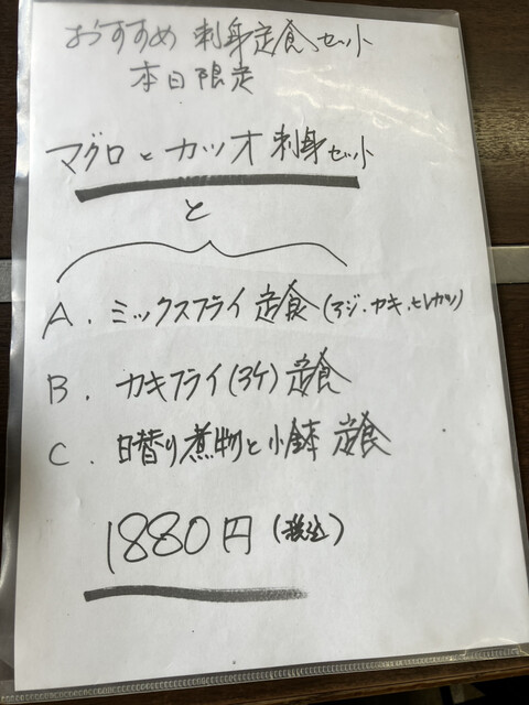 昼飯を求めてフラフラしていたらあったお店です。居酒屋さんのようなボトルキープの多い店内で近くにあったら夜に行きたいですね。マグロとカツオ刺身、ミックスフライ定食をオーダー。刺身は新鮮で薬味多めで美味しく、フライも美味しくですがヒレカツが恐らく冷凍物で微妙でした。全体的に好印象のお店です。