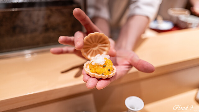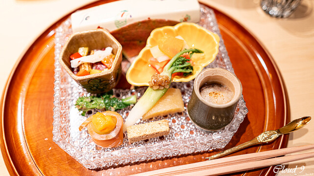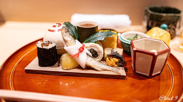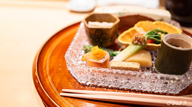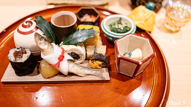 · 前菜 : 菊花 蒸し雲丹 車海老 イクラ 北寄貝 玉子豆腐