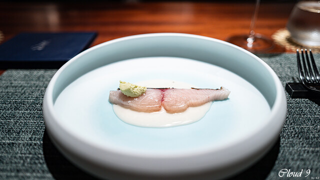 From Ito by Mr.Hasegawa, Shinkei-jime Spanish Macherel smoked with lemongrass straw Rice and Chinese sweet rice wine vinaigrette sauce