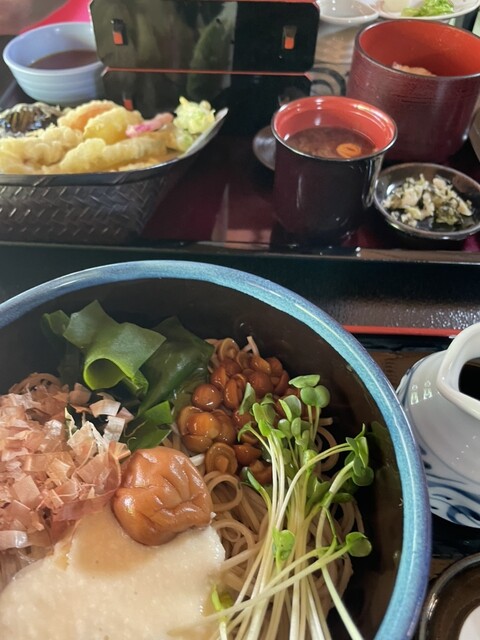 大好きなとろろになめこやわかめ、貝割れに梅干しが乗っています。お汁も甘めでお蕎麦が何と言っても風味があって最高でした!