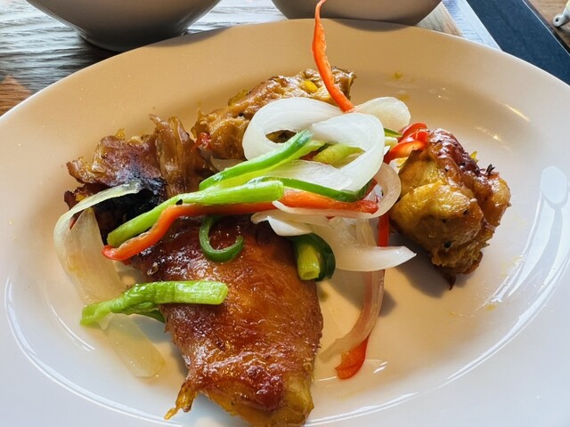 ニラのガーリック炒め、鶏肉のライム葉焼き、レモングラス串の海老すり身揚げ