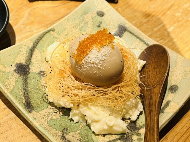 ポテサラも意表を突くビジュアルだし、カニクリームコロッケもミートソースの絨毯に乗っかって出されるし…なんと言っても、この日のお通しが、苺をハモンセラーノで包んで生クリームで和えるという斬新さ!