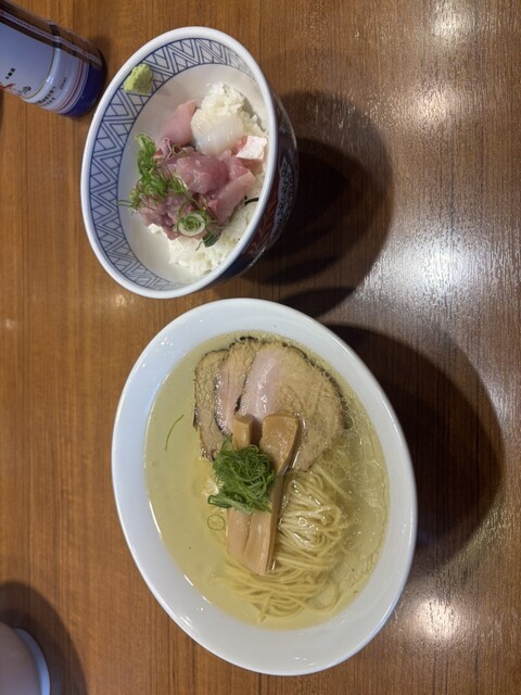 ラーメンは見たこともない透き通ったスープと芳醇な鳥の香りに驚く。加えて海鮮丼はマグロにハマチにイカの3種盛りの様子。