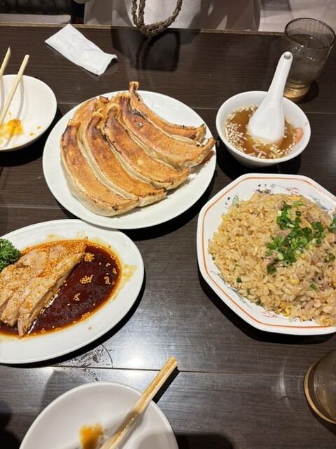 ずっと前から行きたかったお店!ようやく行けて嬉しいです!!平日でしたがさすが人気店、19時頃に行きましたが行列を作っていました。40分ほど待って入店できました。餃子とチャーシューチャーハンとよだれ鶏を頼みました。餃子は想像よりもでかいでかい、、顔のサイズぐらいあります笑 皮はもっちり肉汁たっぷりジューシーで美味しすぎる...!