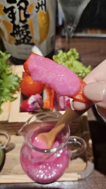 ビーツ、小松菜、にんじんで作られたドレッシングはどれも美味しいしお野菜の味も引き立ててくれる。