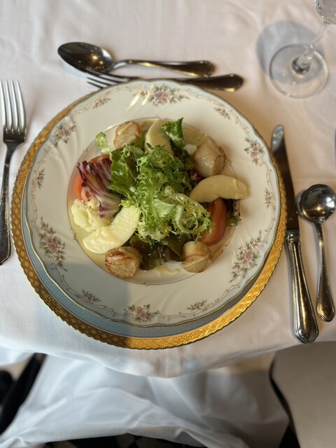⚫︎帆立貝のソテーサラダ仕立て・フォアグラのソテー・サツマイモのクリームスープ・牛ヒレ肉のステーキ・デザート・コーヒー