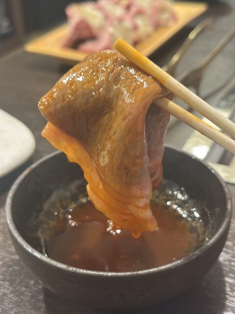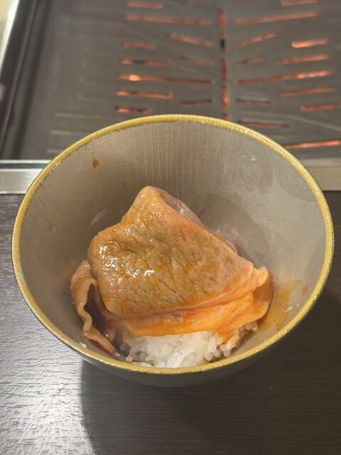 サーロイン焼きすき焼きしゃぶは、サッと炙ってもらい、龍の卵タレにダイブ。ミニご飯の上にお肉を乗せて、さらに卵タレを回しかけて最高すぎました!