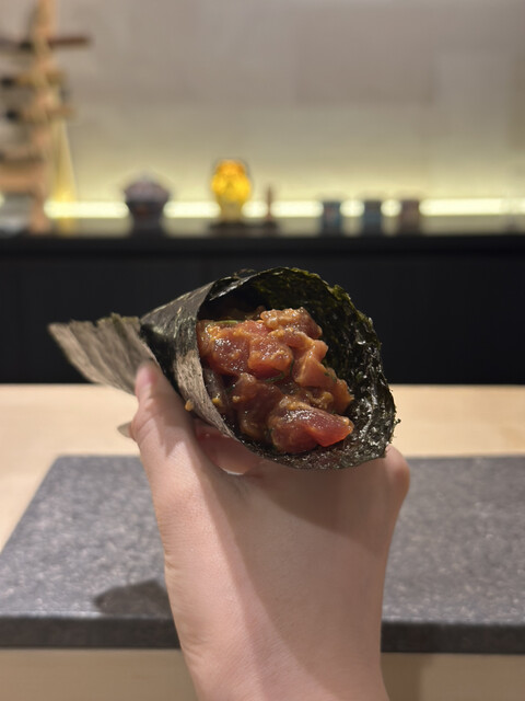 5. 帆立の海苔巻き(手渡し):帆立が炙られていて香ばしさと海苔の風味とよく合う
