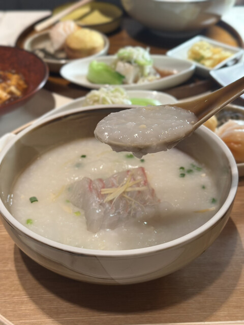 この日のおまかせ中華粥は「鯛のお粥」でした。お粥に鯛をのせてすぐ口に運ぶと、刺身のようにとろける食感。少し置いてからいただくと熱が入り、やわらかくほどけるような味わいに変化します。1杯で2通りの美味しさが楽しめ、優しい風味で胃にも負担なくいただけます。