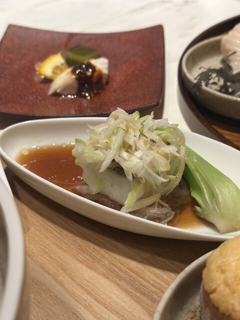 セットには、点心2種、鮮魚蒸し、前菜3種盛りが付き、ランチとしてはかなり豪華。特に「エビ蒸し餃子」は大ぶりのエビをもちもちの皮で包んだ逸品。もう一つの点心はメロンパンの中からチャーシューが現れるという驚きの組み合わせで、甘味と塩味のバランスが絶妙でした。