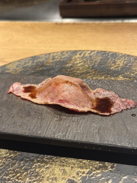 ️鉄板で煮詰めて作られたソースをかけて、さらに炎で炙られた肉寿司は、見て楽しい、食べて美味しいお肉の脂が甘くてとろけました!