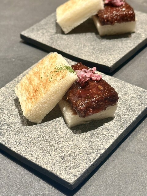 鉄板で焼いたパンを使った黒毛和牛カツサンドは、しば漬けのタルタルが京都らしい一品。フィレ肉のソースカツが柔らかくて驚きでした。
